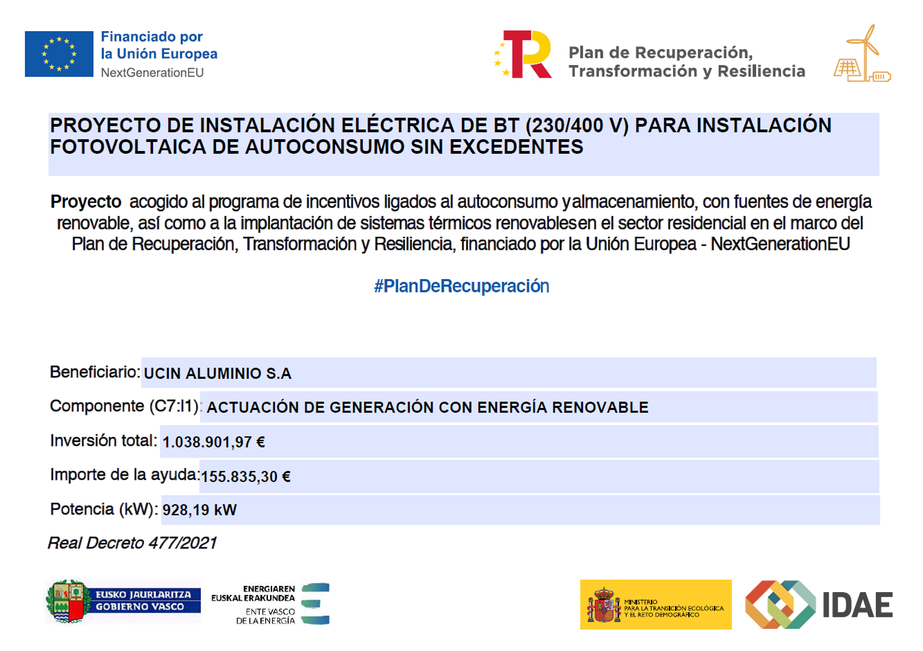 La empresa Ucin Aluminio ha implantado una instalación solar fotovoltaica de autoconsumo en su planta productiva, situada en Usurbil (Guipúzcoa). Este proyecto reafirma el compromiso de la empresa con el uso de las energías renovables, consiguiendo disminuir su huella de carbono y alinearse con los objetivos de transición energética de la Unión Europea.